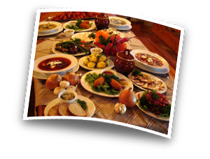 Les plats traditionnels sont le Borsch (soupe aux légumes et à la viande ayant pour base la betterave), les Pilminiés (gros raviolis à la viande), les Varrinikis (raviolis aux pommes de terres ou au fromage mais aussi à la cerise et à la crème), les Gallupsis (feuilles de choux farcies au riz et à la viande dans une sauce tomate), les Schachliks (grosse brochette de viande marinée et grillée au feu de bois). Mais il y a également une grande variété de plats à base de viandes et volailles, de charcuterie, de fromages, de poissons, de crustacés (ne pas rater les écrevisses) et coquillages (les moules de la Mer Noire sont d’une taille et d’une saveur incomparables), sans oublier le caviar et la vodka.